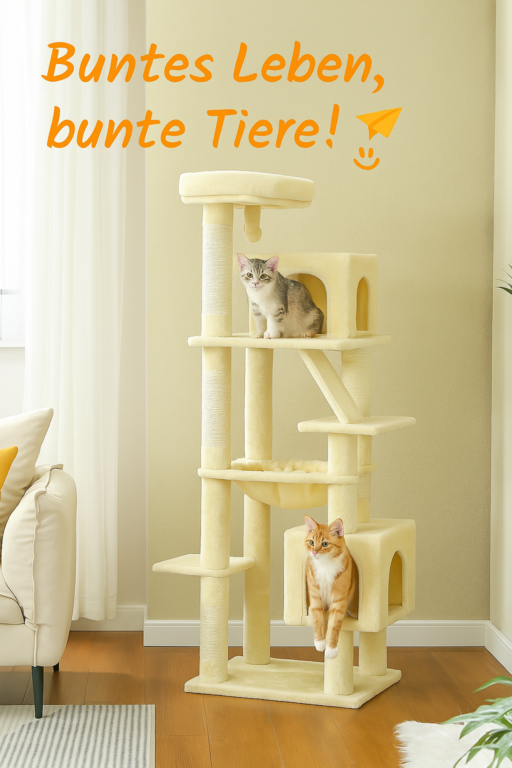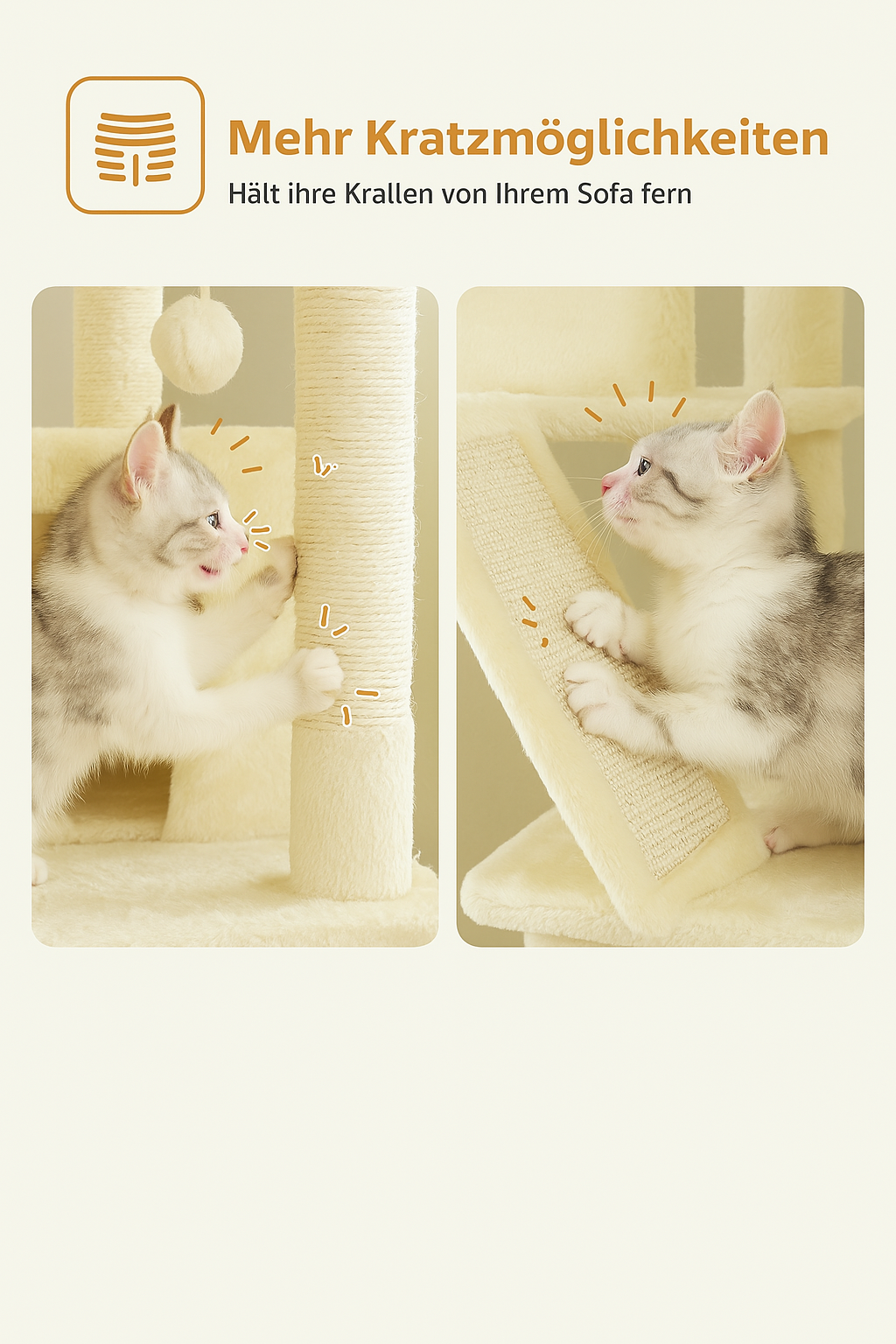 - 🪵 Kratzsäulen: Umwickelt mit robustem Sisal – ideal zur Krallenpflege